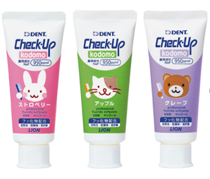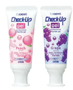 当院では子供用の歯磨き粉として、チェックアップのジェルタイプとペーストタイプを販売しています。年齢に応じた適切な量を用い、ブラッシング後は軽く吐き出し、口をゆすぐのは1回で大丈夫です。