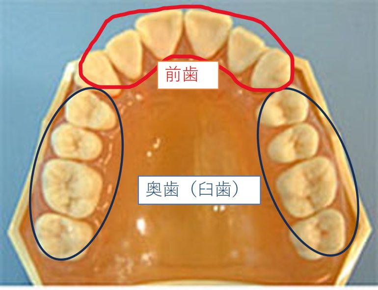 前歯と奥歯(臼歯)を比較すると、奥歯(臼歯)のほうが四角く大きな形をしており、咬む面(咬合面)に深くて複雑な溝があります。また奥の方が見えにくく磨きにくいことが多いので、奥歯(臼歯)の方がむし歯になりやすい傾向があります。