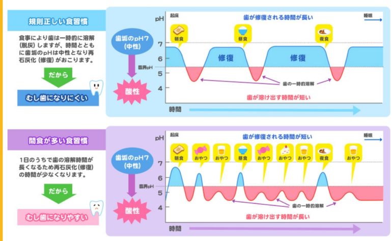 間食の回数が多いと、臨界pHを下回る時間が長くなり再石灰化の時間が少なくなり、むし歯が発症しやすくなります。また飲食回数を減らすことで、砂糖の総摂取量の減少にもつながりやすいです。