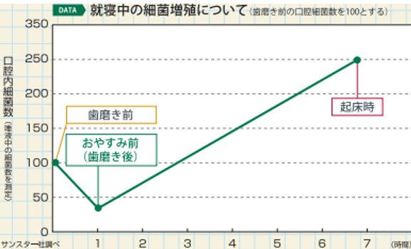 また寝ているときは唾液の分泌量が減り、唾液の自浄作用が働かなくなり、細菌が増殖しやすい環境になります。