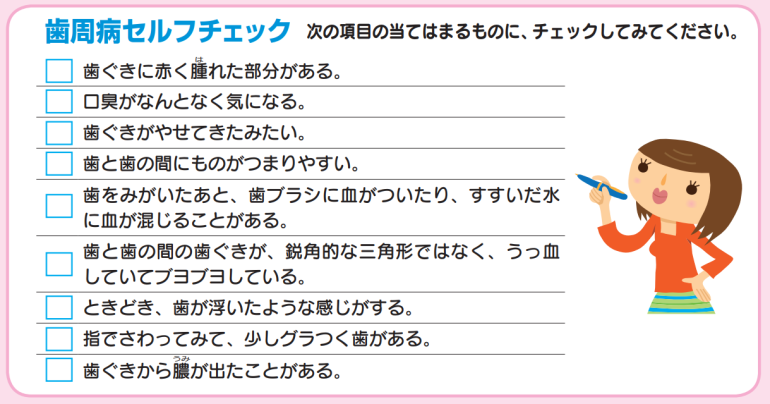 歯周病は「サイレント・ディジーズ(Silent desease)]」とも呼ばれ痛みなどの症状が出にくく、初期段階では、なかなか自覚できません。しかしながら歯周病は、糖尿病やメタボリックシンドローム、心臓病、早産など様々な全身疾患との関連が報告されています。