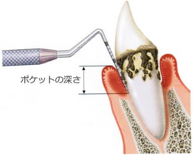 歯と歯茎の境目からプローブという専用の道具を用いて、歯周ポケットの測定を行います。歯周病が進行していると、歯周ポケットの値が深くなっていきます。4ミリ以上から歯肉に炎症が起きている目安になります。