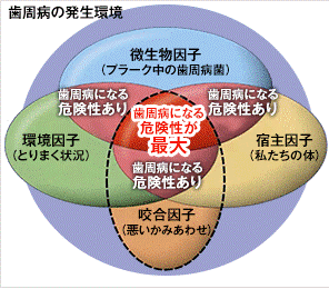 宿主因子は各々が持っている性質のことで、年齢や性別、人種などです。また代謝遺伝子異常や炎症・免疫関連の遺伝子の異常が関連するとも考えられています。他にも糖尿病や肥満、Dawn症候群などは歯周病の重篤度が高くなることで知られています。
