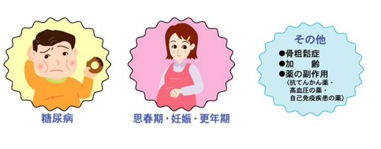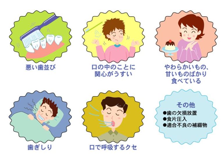 喫煙や口の中の清掃不良、ストレス、歯並びなどが含まれます。また汚れがたまりやすかったり、歯に合わなくなっている詰め物や被せものも歯周病になりやすい危険因子です。口呼吸の習慣がある人も粘膜や歯肉が乾燥しやすく炎症を起こしやすくなるので注意が必要です。