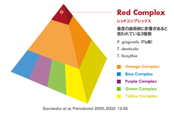 歯周病原菌を病原性ごとにグループ分けした時に、一番病原性の高いレッドコンプレックス(Red Complex)の比率で病原性の高い歯周病かどうかの分かれ目となります。病原菌のバランスが崩れたり、病的な量まで増えると歯周病が発症するので、レッドコンプレックスが存在しているからと言って、必ず歯周病が発症するわけではありません。