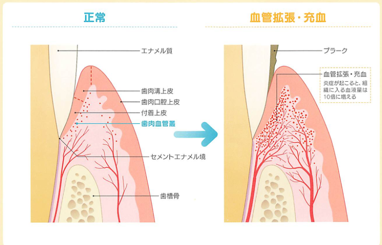 歯と歯肉の境目あたりにプラークが残っていると、プラーク内の細菌がだす毒素によって組織内の炎症性物質が働いて、血管が広げられます(血管拡張)。炎症により血管が広がり、通常の10倍以上の血液が血管に流れ込みます(充血)。血管内が大量の赤血球に満たされるため歯肉が赤く見えるのです(発赤)