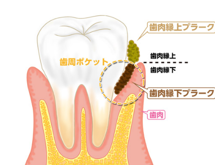 ただ歯周ポケットが深くなってしまっている場合に溜まってしまう歯肉の下の部分(歯肉縁下)のプラークや、こびりついた歯石はセルフケアでは除去できません。この部分は、プロケアでの除去が必要です。