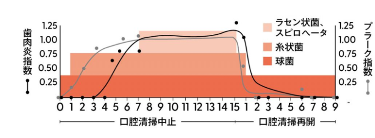 ずいぶん前の研究になりますが、実験でブラッシングの効果が判明しています。プラークはブラッシング中断後3日目から増え続け、5日目には歯肉炎が発症、7日目ごろから歯周病原性の強い菌が出現してきます。しかしブラッシングを再開すると、プラークおよび歯肉の状態は改善していきます。