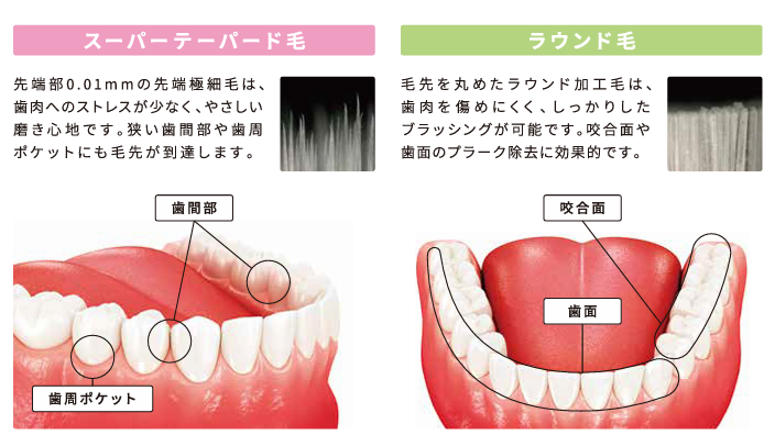 3種とも、まるくなめらかな毛先で、一般的な歯ブラシと比べて1束の密度が高く、たくさんの毛がしなやかに動くのでしっかり細かく汚れを落とせます。