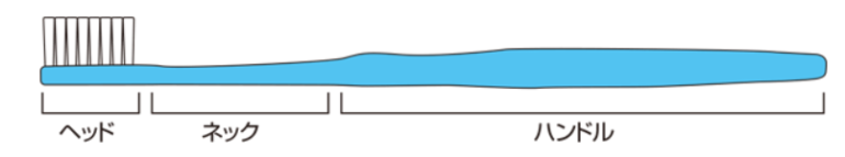歯ブラシは毛を植えてある「頭部(ヘッド)」、握る部分の「把柄部(ハンドル)」、頭部と把柄部をつなぐ「頸部(ネック)」から成り立ちます。