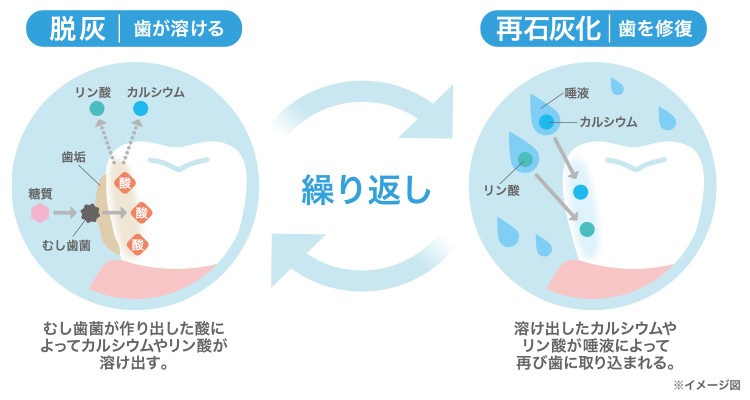 このプラークの中に含まれる細菌が食事中に含まれる糖分を分解すると酸が作られ、この酸によって歯の表面が酸性になり歯の成分であるカルシウムが溶け出します(脱灰)。その後、酸は唾液の働きによって中和され、溶け出したカルシウムが歯の表面に戻ります(再石灰化)。