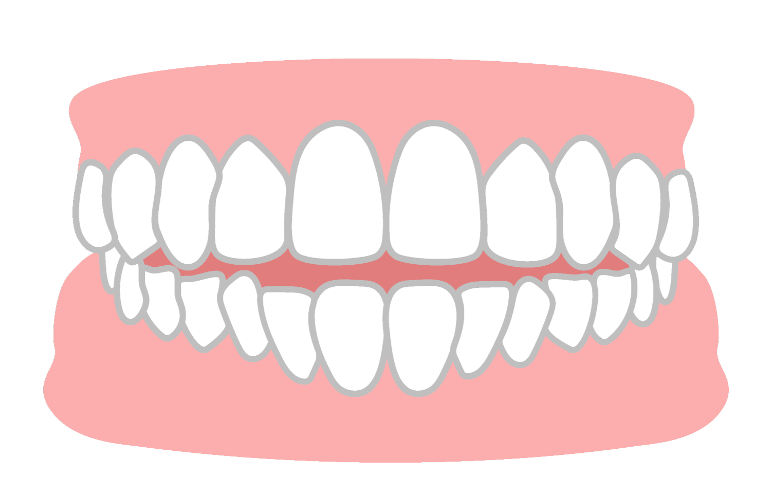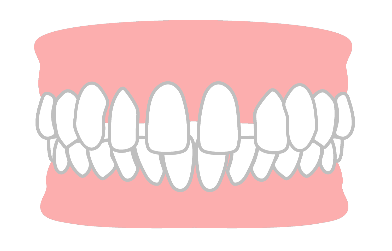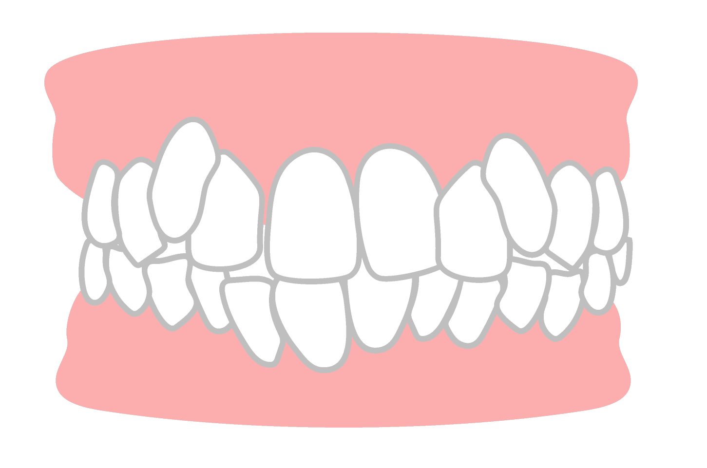 歯が重なり合って、ガタガタに不揃いに生えている状態です。あごの骨のスペースが足りない、または歯が大きいことが原因で起こります。歯磨きがしにくく、むし歯や歯周病のリスクが高まります。