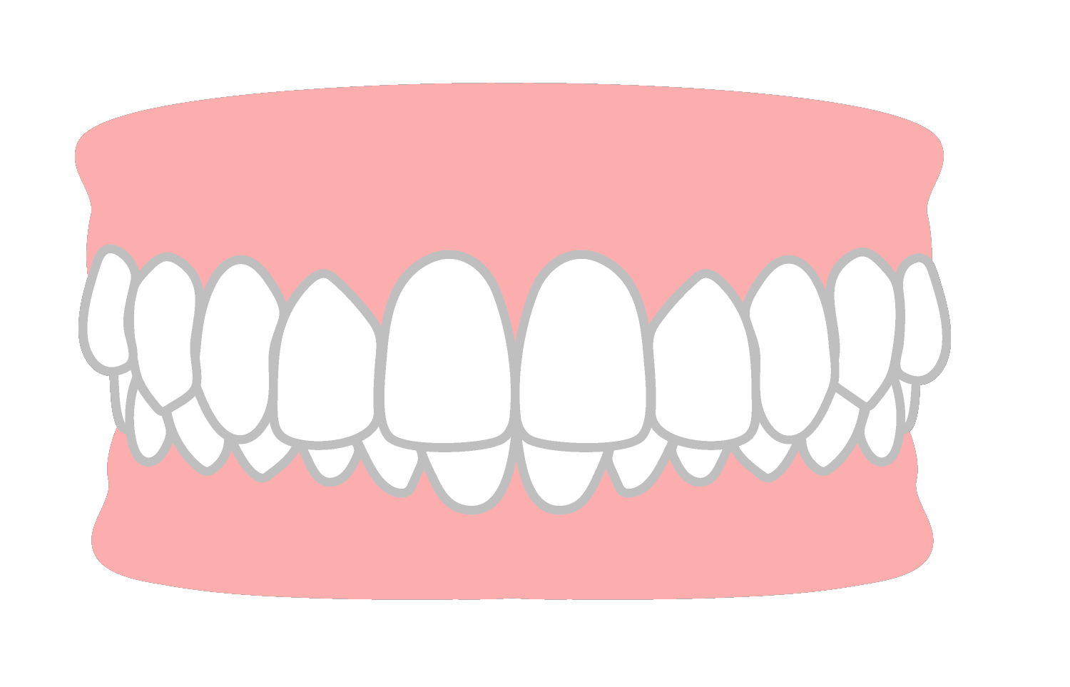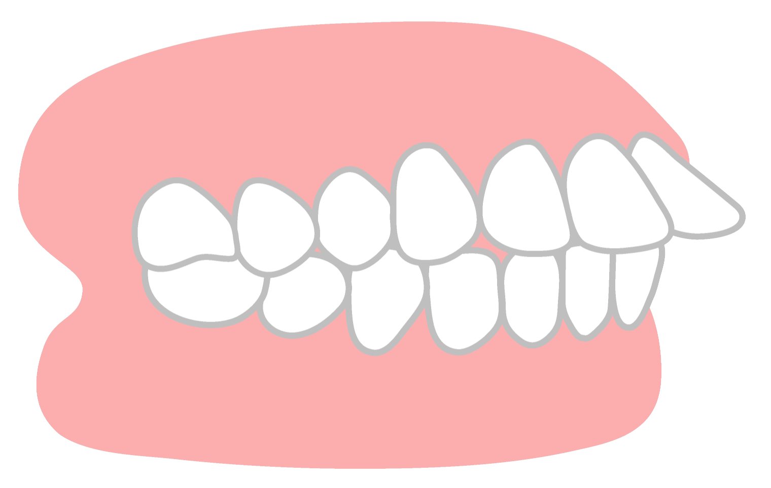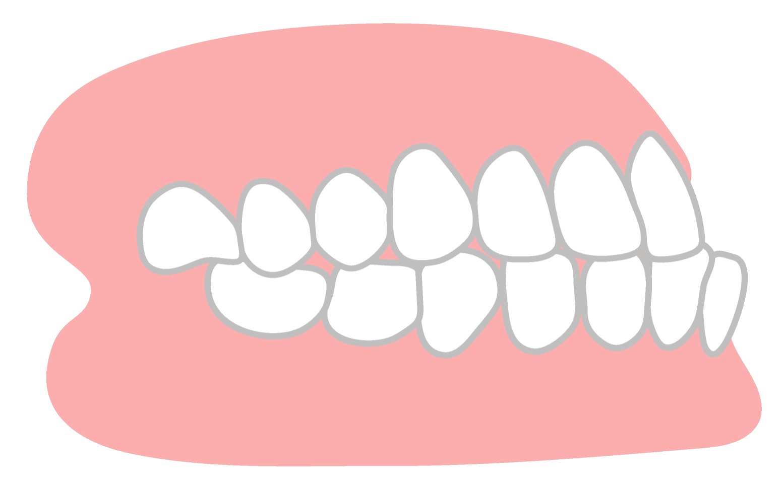 歯が重なり合って、ガタガタに不揃いに生えている状態です。あごの骨のスペースが足りない、または歯が大きいことが原因で起こります。歯磨きがしにくく、むし歯や歯周病のリスクが高まります。